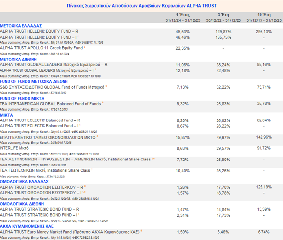 Η ALPHA TRUST, η παλαιότερη (από το 1987) και μεγαλύτερη ανεξάρτητη εταιρεία διαχείρισης κεφαλαίων, πέτυχε με συνέπεια τη συνέχιση των θετικών αποδόσεων και το 2025. Οι διαχρονικά θετικές αποδόσεις επιβραβεύτηκαν, με τα υπό διαχείριση κεφάλαια να αγγίζουν το νέο επίπεδο ρεκόρ των 2,3 δις. ευρώ, με τη συντριπτική πλειονότητα των χαρτοφυλακίων να υπερβαίνει τους δείκτες αναφοράς και τους στόχους που είχαν τεθεί.